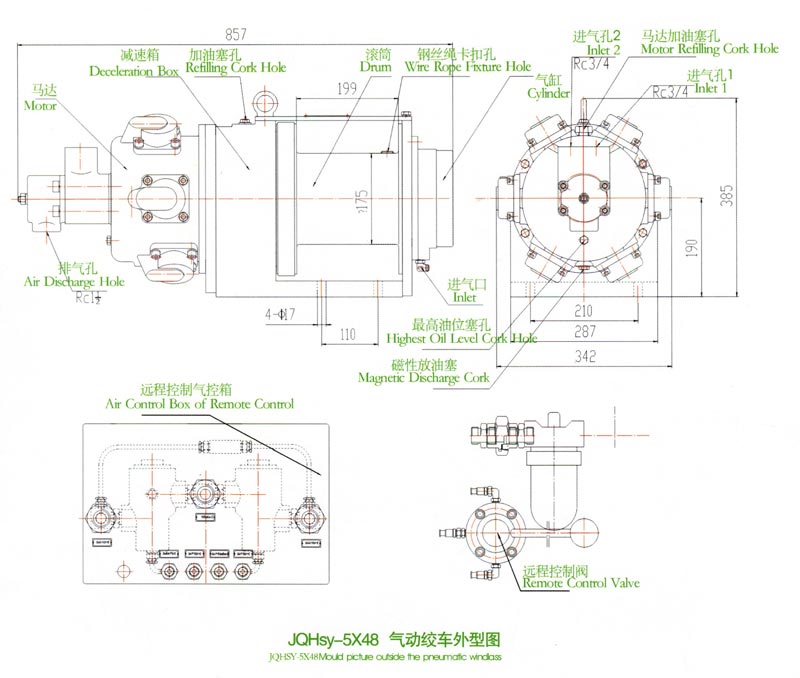 JQHSY-5X48远程控制气动绞车,采用压缩空气为动力.推动TMH4A活塞式气动马达工作。再通过二级齿轮减速把扭矩传给滚筒。气动绞车的操纵,是靠远程手操纵转向阀实现正转、反转、停止等项动作的。为保证气动绞车的安全性,该气动绞车还具有停车刹车功能。特别适于海上、陆地油田钻井二层平台上拖拉钻杆及套管之用。